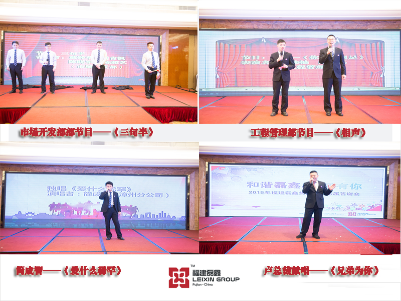 晚宴上各个部门带来了精彩纷呈的节目,有行政、人事、资质三个部门带来的妙趣横生的小品《非诚勿扰》,有财务部带来的别致典雅的古装走秀《穿越》,有市场开发部带来的励志昂扬的《三句半》和悦耳动听的歌曲《爱什么稀罕》,也有工程管理部的生动活泼的相声《你在看国足》。同时,晚宴还对2015年度的先进集体和个人进行表彰。