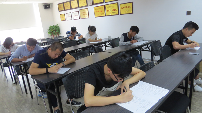 日期:2016/7/28 来源:市场开发部 作者:李敏君为了检验新员工在实习期、试用期工作学习和岗位技能的掌握情况,公司于7月25日上午举办了新员工转正考试,本次考试由人力资源部根据各部门负责人提供的资料分别进行命题,统一排版印刷,并协调考场人员座位分布,为避免同类试卷人员相邻座次,人力资源部为此次考试出了AB卷。