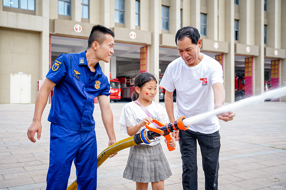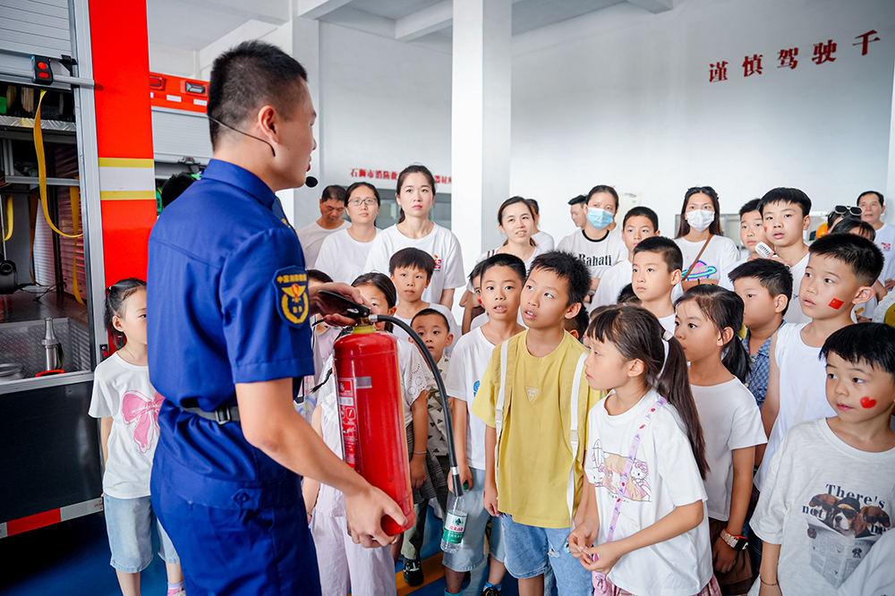 随后,全体人员来到石狮市消防救援大队,观看消防官兵的实战演练,学习消防安全知识。孩子们兴奋地体验了消防器材操作,登上云梯消防车,化身“小小消防员”,在互动中增强了安全意识,更对消防员的英勇奉献充满敬意。