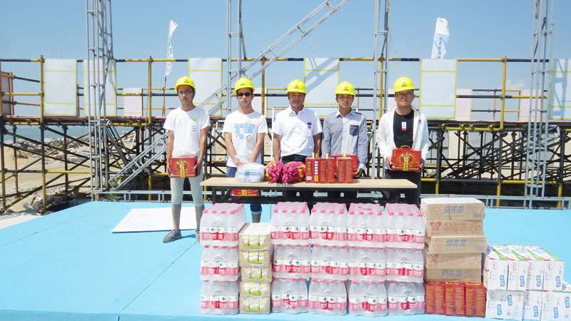 伴随着正午的烈日,经过3小时的车程,集团公司一行人到达了漳州的古雷工程项目观礼台。集团公司常务副总裁带领集团员工为一线工人代表送上了矿泉水、加多宝、菊花茶、冲泡凉茶、牛奶、藿香正气水等防暑降温用品,让一线工人代表们在高温天气中感受到了来自公司舒心的凉意。