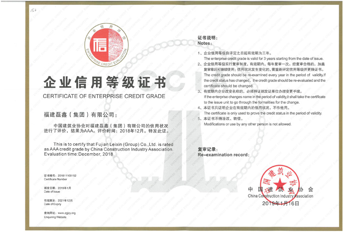 全国建筑业AAA级信用企业是由各地区建筑业协会推荐,中国建筑业协会专家评价组审定、体现国家建筑业企业综合能力的权威荣誉,通过对企业基本素质、经营及财务能力、管理能力、竞争力等五方面指标进行考核而最终审定的行业内诚信经营的标杆企业。旨在健全我国建筑业的信用体系,加强建筑行业自律,增强我国建筑从业者的信用意识,切实提高工程质量和安全管理水平,推动我国建筑业持续健康发展。据悉,建筑业企业信用等级分为AAA、AA、A、B、C三等五级,磊鑫荣获的AAA级信用企业正是等级最高的。