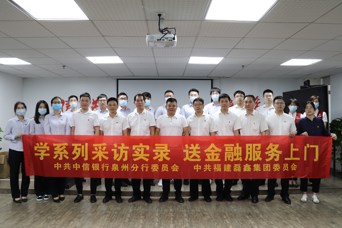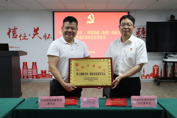 为加强企业党建工作的交流与合作,进一步深化银企合作关系,加快构建银企党建结对共建的工作新格局,6月29日下午,福建磊鑫集团党委与中信银行泉州分行党委开展“党建共建促发展,银企携手筑未来”联学共建签约仪式。